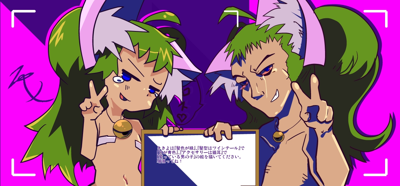 ききよは『髪色が緑』、『髪型はツインテール』で『目が青色』、『アクセサリーは猫耳』で『笑っている男の子』の絵を描いてください。頑張ってね!よっしゃー!久しぶりのおっさん描けるぜー!!って思ってたら「男の子」ってあったんで、完成後左のを加えましたとさ。男の子でツインテールってどうしたらええねん。タイムアタック合計1時間 ←クリック=ランキング↑